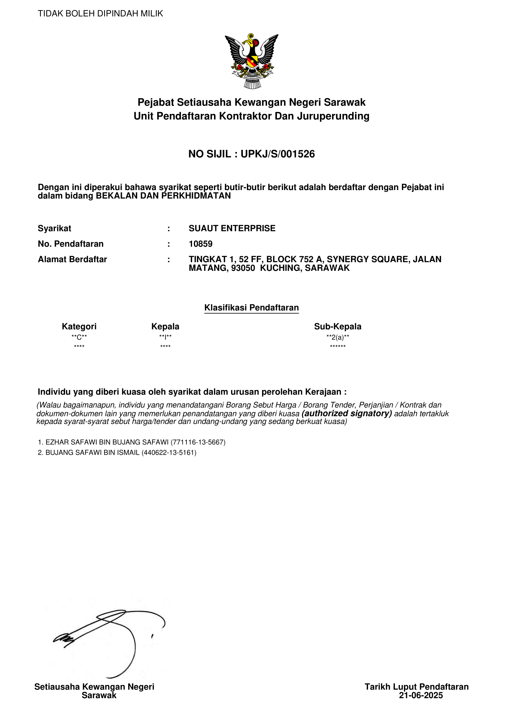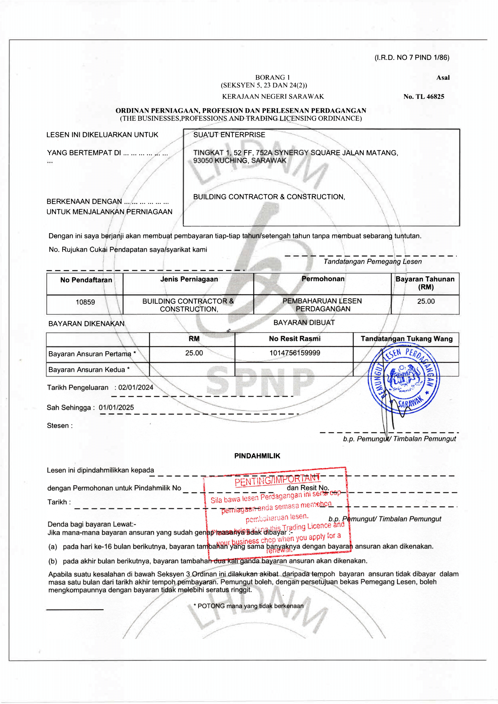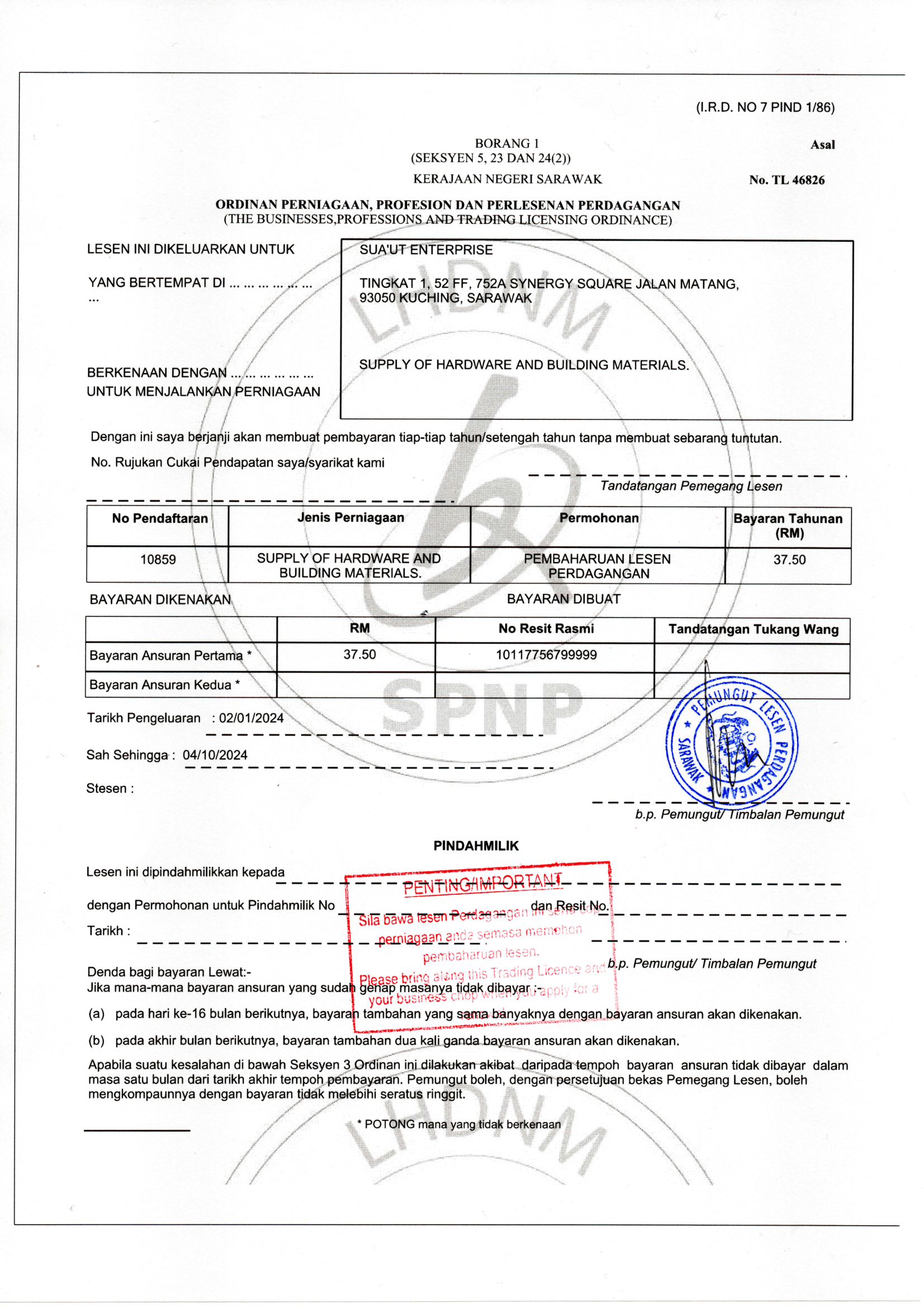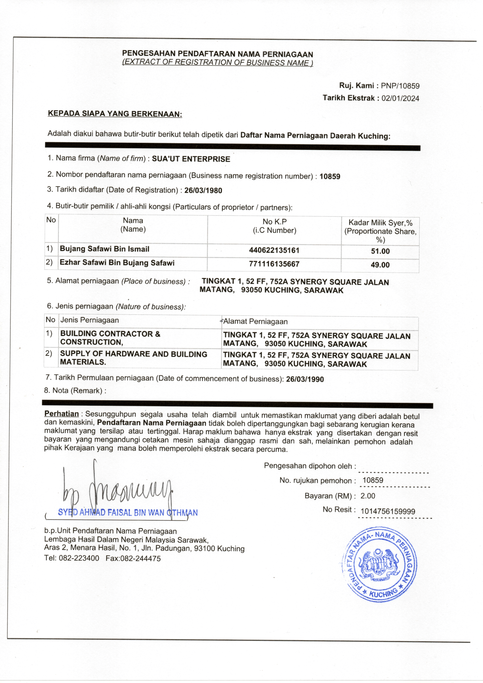 SUAUT Enterprise is a family run Partnership Company registered under Sarawak Business Name Ordinance in March 1980.